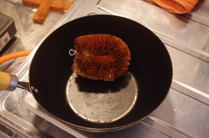 使い終わったらそのまま流水とたわしでごしごし洗います。表面の油分を取ってはいけないので洗剤を使ってはいけません。