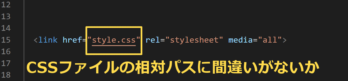 もう一度CSSファイルの相対パスが正しくhref属性値として記述されているか、そして、cssファイルが置かれている階層を確認し正しく記述しましょう。