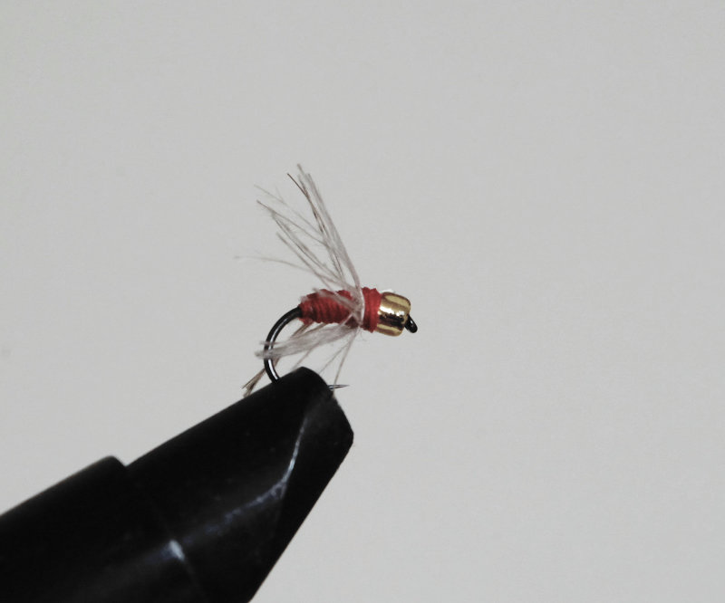 金のビーズヘッド、赤のスレッドのニンフタイプの毛ばりです。少ないハックルボリュームで着水後スッと沈みほかの二つの毛ばりでは探れない深場に流すことができます。フロロラインを使うとより毛ばりの特性を発揮できます。