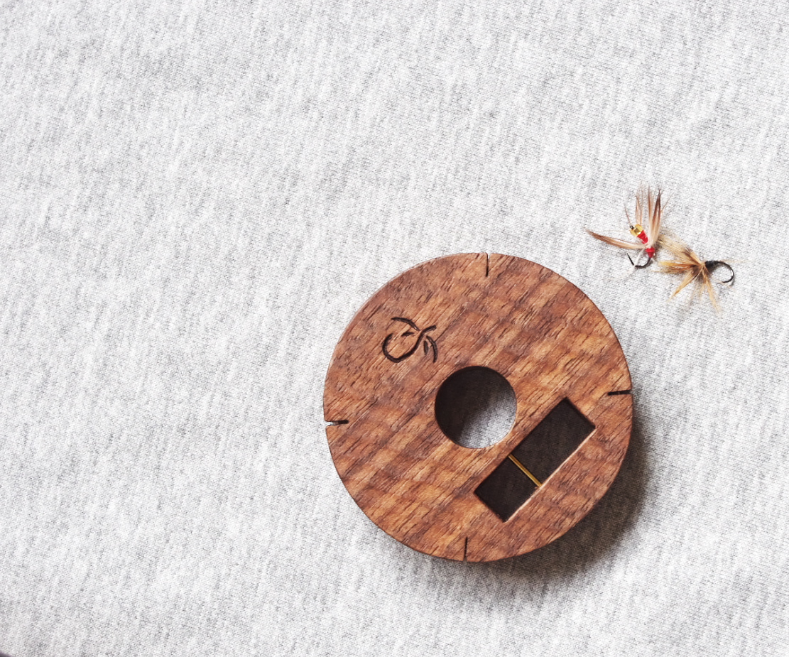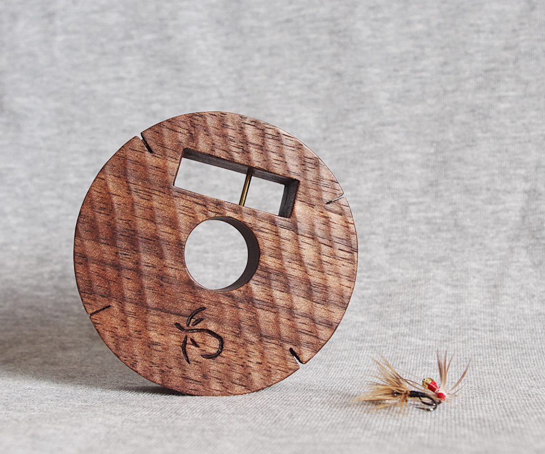 刳りだしたチェリーの無垢材にブラックウォールナットのフタが真鍮ネジで取り付けられています。親指一本で気持ちよく開き、毛ばりを選択できます。