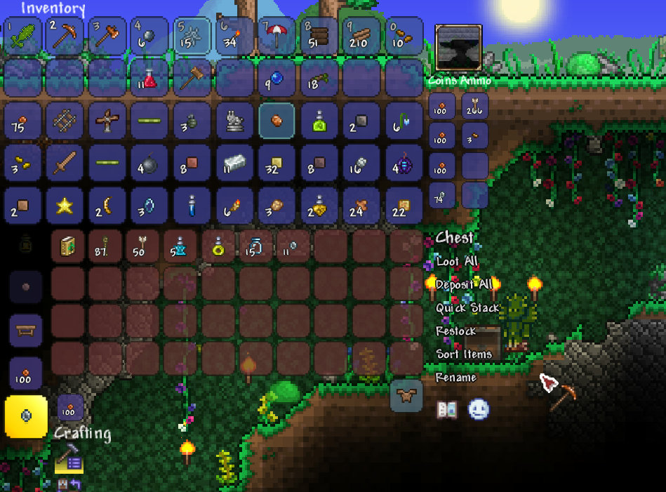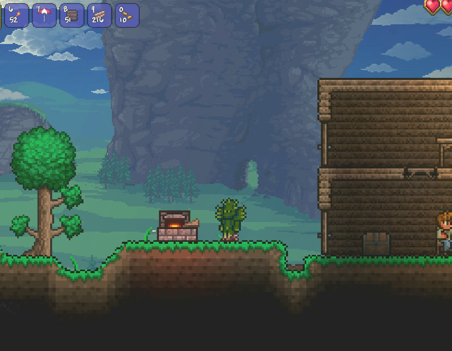 テラリアの世界では木は自生しません。だから伐採したらその分植えておかないと、どんどん遠くまで木を切るために出かける必要が生じます。木を植えるのは簡単で、伐採時に入手できるドングリを地面に置くだけでOK。