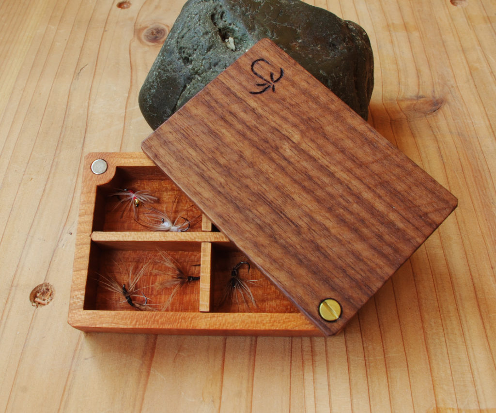 渓流での釣りの流れを止めず、スムーズに毛ばり交換ができるように設計した、テンカラ・フライ用の木製毛ばりケースです。